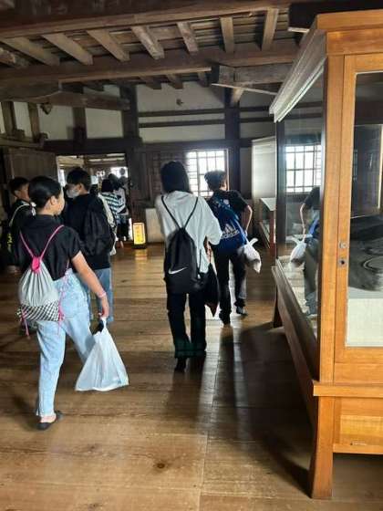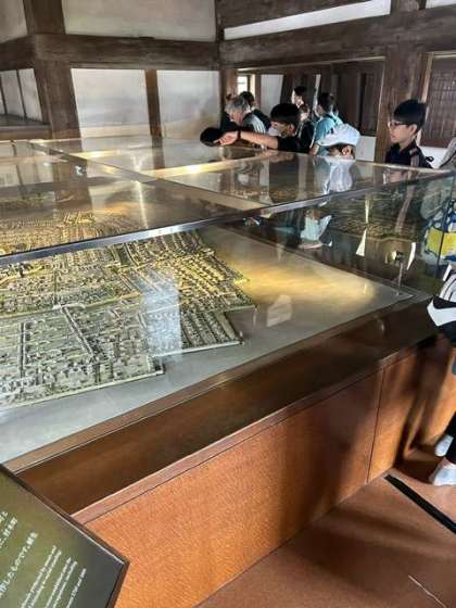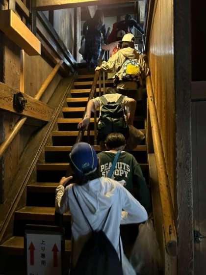 お城の階段はとても急でした。一般の方々に片方の通路を空ける、ピースな6年生です。