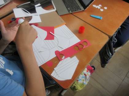 総合の学習で、協力して紙でケーキを作る体験を行いました。
