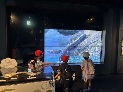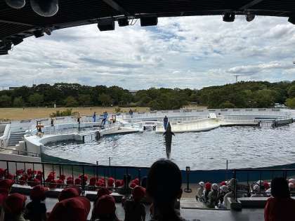 水族館では、グループごとに館内を回りました。オオサンショウウオやペンギン、エイやクラゲなど、様々な生き物を見て、子どもたちはとても楽しそうでした。飼育員さんの様子にも目を向けて、質問をしている子どもたちもいました。グループ行動の後は、イルカスタジアムでイルカの学校「体育の時間」を見ました。イルカとトレーナーさんの息の合った姿を見て、子どもたちは「すごい!」と大興奮でした。