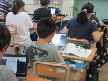 教科書を読み返しながら、タブレットを使って自分の考えを記録しています。