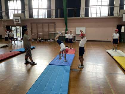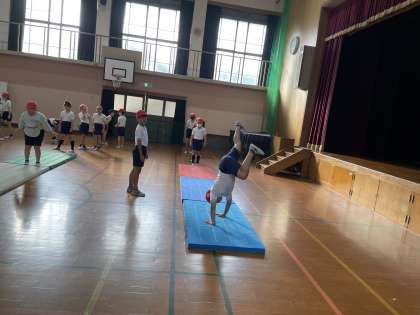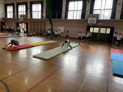 それぞれが目標をもって、マット運動の学習に取り組んでいます。アドバイスし合ったり、励まし合ったりしながら、お互いを高め合って学習を進める4年生です。苦手な技にも果敢に挑戦する姿がだんだん増えてきました。技の発表会がとても楽しみですね。