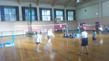 体育で、ソフトバレーボールの学習が始まりました。ボールを落とさないように、みんな必死です。声をかけあったり、ポジションを工夫したりしながら、いろいろな作戦を考えてゲームを進めています。