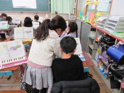 みんなで合わせて演奏するために、ペアで鍵盤ハーモニカの練習をしました。