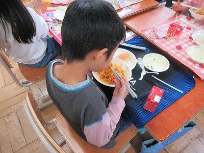 はじめての給食はすぱげてぃのみいとそうすにでした。グループで楽しく話しながら毎日おいしい給食をたくさん食べています。バランスよく残さず食べて、元気にすくすくと成長してほしいと思います。