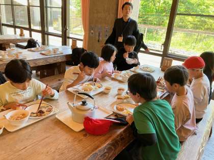 お昼ご飯の時間です。まずはしっかり食べてその後活動します。「おいしそう」「いいにおい」とみんな楽しそうです。