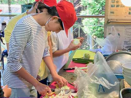 今日の夜ご飯は「すき焼き風煮」です。かまど係、ごはん係、おかず係に分かれて協力して進めていきます。