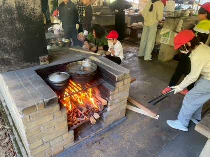 ごはんやすき焼き風煮が美味しくできるか見守っています。山の家の先生にも火おこしのコツを教えてもらいました。