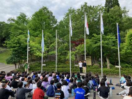 3日目の朝になりました。まずは、合同の朝のつどいです。それぞれの学校の紹介を聞きました。いろいろな学校の5年生が頑張っている姿を見ることができました。