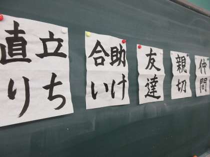 社会を明るくする運動の取組で、「友達」や「仲間」、「助け合い」などの言葉を選んで書きました。力強い字を書くことができました。
