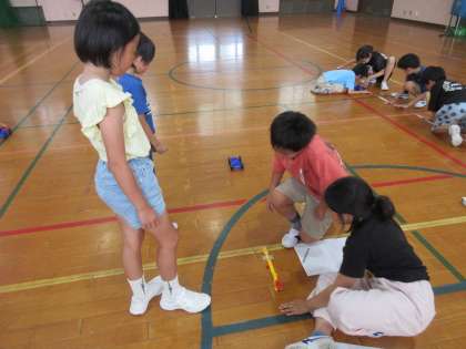実験を通して、ゴムを伸ばす長さによって、車の進む距離が違うことに気付き、「ゴムの本数を増やしたらどうなるんだろう。」や「大きいゴムを使ったらもっと進むのかな。」など、新たな疑問や調べたいことも出てきました。