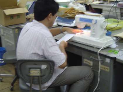 応援で使うタスキを,一生懸命縫っている職員がいます。