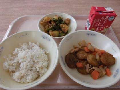 9月18日(木)の献立は「麦ごはん・平天とこんにゃくの煮つけ・みそかんぷら」でした。