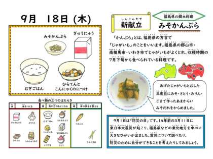 みそかんぷらは、9月の新献立で福島県の郷土料理です。福島県の一部地域の方言でかんぷらはじゃがいもを表す言葉で、夏に収穫したじゃがいもを使って作られてきたそうです。