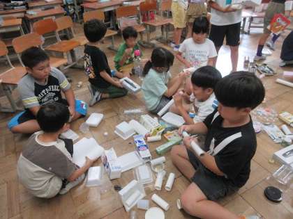 生活科の学習では廃材を使って、特徴をつかんだり、その特徴をつかって遊んだりする活動をしました。