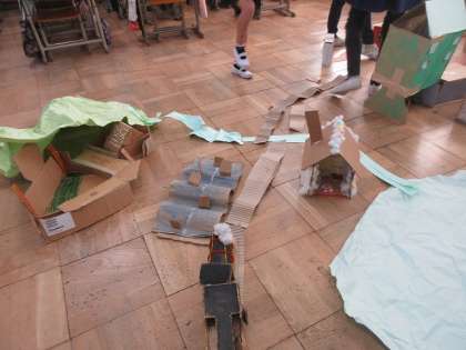 4年2組のまちは、自然エリアやお店エリアなどに分けて並べました。工夫があっておもしろいです!