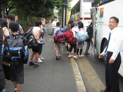 バスの中はどうしても空気が悪くなってしまいます。インフルエンザ感染予防のためにも,全員マスク着用で移動します。また,バスに乗り込む際には手指消毒剤で滅菌に努めます。