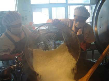 だしをとり,調味料,食材,お米,全てを3等分にし,それぞれ釜にいれて炊きます。