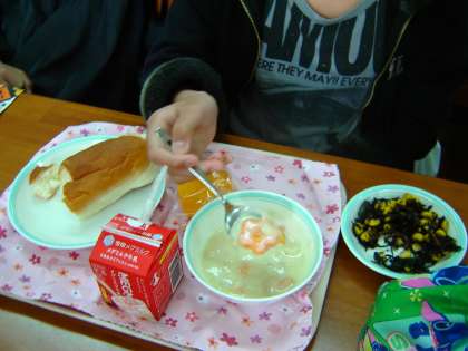 そしてなんと!校長先生のシチューからも桜の花のにんじんが!「いいなあ〜」と,うらやましそうな子どもたち。とてもうれしそうな校長先生でした。