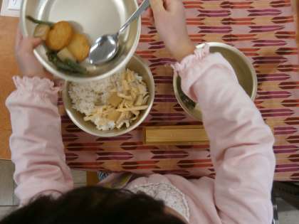 5月を迎え,さわやかな風が気持ちのよい季節になりました。給食でも季節感を大切にしています。今日は今が旬のたけのこを使って,自分でごはんに混ぜる「たけのこごはん」でした。たけのことしいたけ,油あげをだしで一緒に炊き,ごはんにまぜたときにちょうどよい味になるようにしょうゆ・さとう・みりんで味つけをしました。