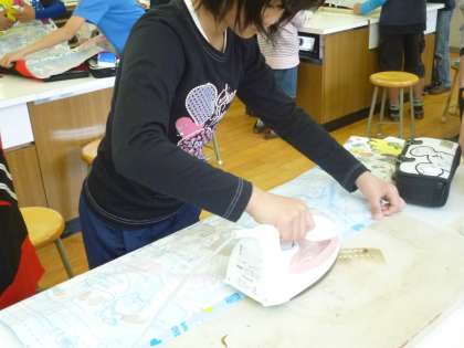 事前に好きな絵柄のエプロンを選び,今週は布を切ったりしつけ縫いをしたりしました。