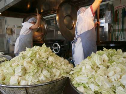 めんは,やわらかくなりすぎないように,硬すぎないようにと加減をみながらゆでます。ちょうど良いかたさになったところで引き上げて,野菜や肉が炒まった釜にくわえます。今日は,中華乾めんが1人30gと多く,1つの釜では全校分をまんべんなく炒めることができないので,2つの釜で具とめんを炒めて仕上げました。
