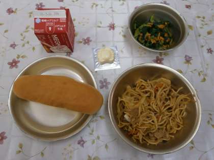 今日は,焼きそばで中華乾めんを食べるので,主食のパンがいつもより小ぶりです。