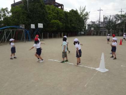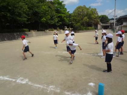 初めは渡す方も受ける方も止まってバトンパスをしていましたが,練習をしていくにつれ,前を見て走りながらできるようになってきました。