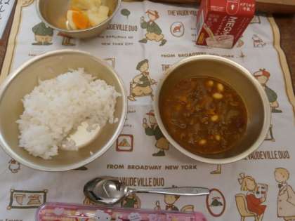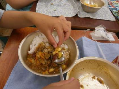 そして,手作りのカレールーとミックスビーンズを加えて子どもたちが取りにくるぎりぎりまで,よおく煮込みました。