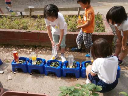 毎朝,水やりもがんばっています。また,見るたびに,あさがおが大きくなってきていることに喜ぶ姿も見られます。