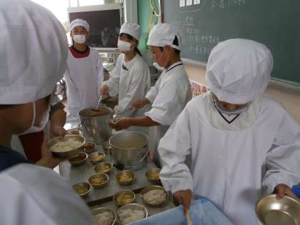 6年生になると,子どもたちは給食当番のプロです。先生の指示がなくても,展示されている見本見て,きちんと自分たちでよそうことができます。おたま何杯くらい入れれば良いか考えてよそいます。