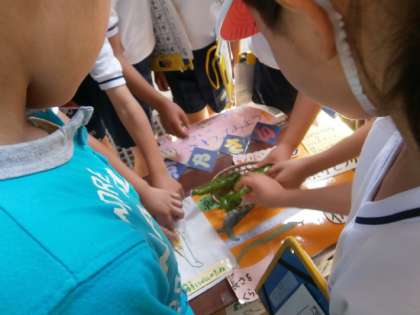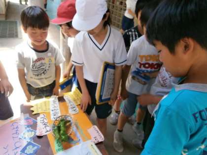 子どもたちは,本物の万願寺とうがらしをさわってその大きさにおどろいていました。くんくんと鼻を近づけて,「ピーマンのにおいに似ているね」という子もいました。ピーマンとこのとうがらしは親戚なので,この感想は正解です。「子どもの鼻はするどいなあ」と思いました。