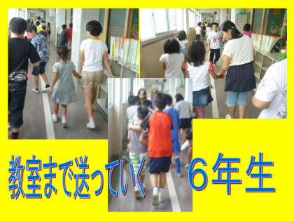 6年生はまず1年生を教室まで迎えにいき,自分の基地教室へと一緒に行きます。手を繋いで優しく声をかけながら。