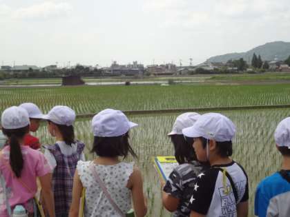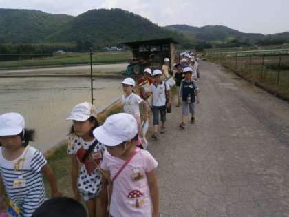 学校を出発してしばらく行くと,田んぼや畑が多くなってきました。「南側と全然違うなぁ」「なんかのどかやなぁ」と言いながら歩きました。北嵯峨のあたりはまさに田園風景が広がっていて,来たことのない子どもたちは自分の家の周りとの風景の違いに驚いていました。