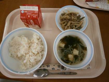 牛乳・麦ごはん・牛肉とじゃがいものいためもの・わかめスープ・プリン