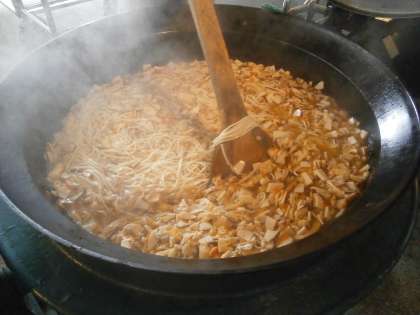今日は,たくさん具の入った「かやくうどん」が人気でした。鶏肉・油あげ・しいたけ・かまぼ・にんじん・細ねぎをだしで炊き,そこの別にゆでておいたうどんを入れます。うどんがのびてしまわないように,子どもたちが給食を取りに来る時間を考えて,だしの中にうどんをギリギリに入れて仕上げます。子どもたちは,できたてのかやくうどんをおいしく食べていました。