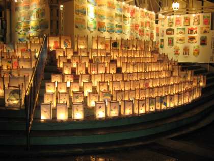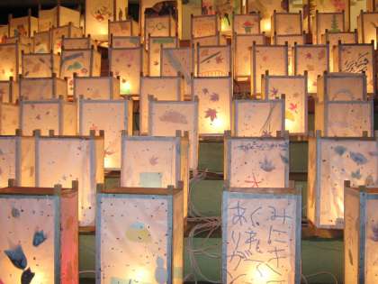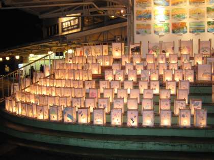 先日の記事でも紹介しましたが,本校5年生による行灯を阪急嵐山駅前に並べていただきました。今年で5回目ですが,「夜と昼とで表情を変える行灯」をメインコンセプトに据えて制作活動に当たりました。道ゆく皆さんは足を止め,デジタルカメラや携帯カメラで本校児童の行灯を撮影しながら,
