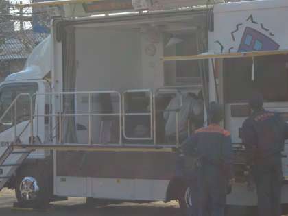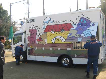 今日の避難訓練には,念願であった最新型の起震車「アース君号」が来校しました。これまでに起こった地震の揺れがどのようなものなのか,体験することができます。また,今後発生が予測されている東南海地震を想定した揺れも体験できます。