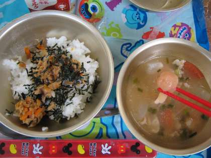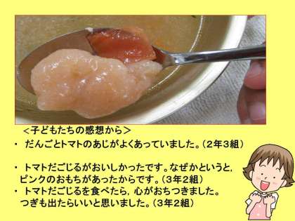 トマト色でほんのり赤いだんごがきれいでした。汁の中にもトマトが入り,夏にさっぱいりとおいしい汁ものになりました。