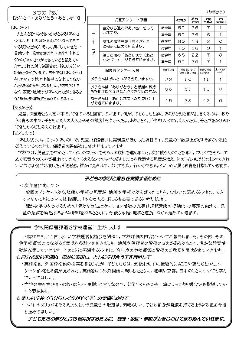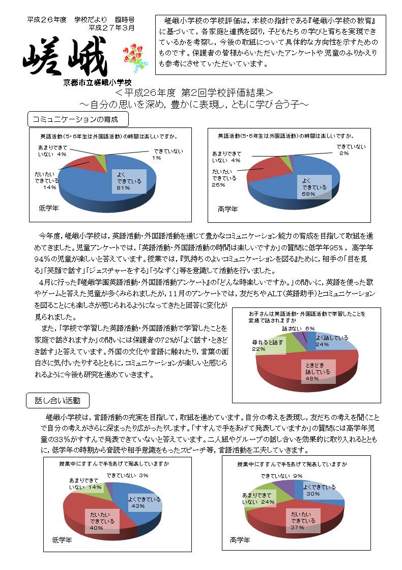 平成26年度第2回目の学校評価結果を配布文書に掲示しましたので,ご覧ください。26年度第2回 学校評価結果26年度第2回 学校評価結果(2)