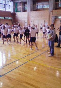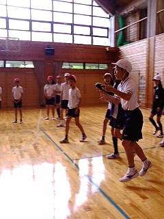 プレイホールでドッジビー(雨の日用のプログラム)を楽しんでいます。