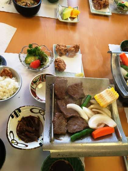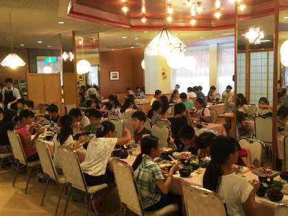 夕食は,玉ねぎに,陶板焼きならぬ瓦焼き?…淡路の名産品がボリューム満点!おいしくいただいた後は,おまちかねの入浴タイムと買い物タイムです♪