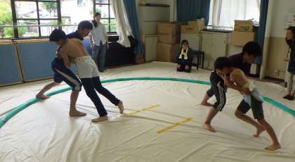 6月25日(土)の3校交流子どもすもう大会に向けて,すもうの練習が始まりました。今日は,5・6年生の練習でした。視聴覚室に敷かれた土俵マットの上で,あたり稽古が行われていました。高学年ともなると,あたりの強さはなかなかのもので…稽古をつけている教員も息を切らし,いい汗を流していました。