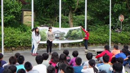 今朝は,いっしょに入所している福西小・上鳥羽小・竹の里小・修学院第二小の5年生たちが集まって,合同で朝の集いを行いました。各校の学校紹介コーナーでは,代表の子どもたちが立派に紹介役を務めました。また,拡大プリンターで印刷した本校自慢の本館を他校の子どもたちにアピールしました。