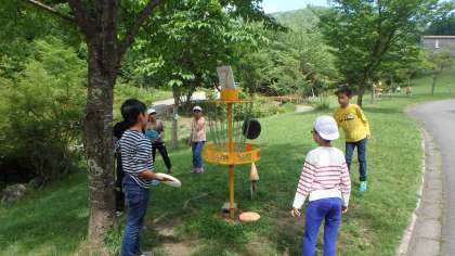 いいお天気です。芝生の緑が美しいです。山の家の澄んだ空気の上を気持ちよく滑るように,ディスクが飛び交います。…川へ…崖下へ…屋根の上へ…。簡単そうに見えて,実はなかなか難しい!だから,1度やったらやみつきになるのですね。子どもたちは,励まし合い,競い合いながら,楽しく活動していました♪