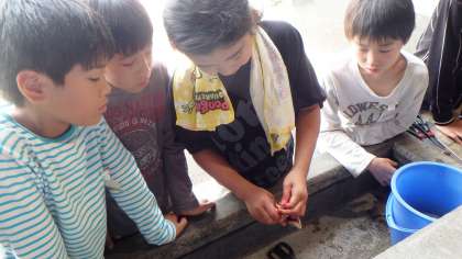 さっきまであんなに元気に泳いでいたイワナがもうバケツの中であおむけに浮かんでいます。先生から読み聞かせも交えた「命をいただく」ということのお話の後,子どもたちは神妙な顔つきで魚をさばいていきました。生きていた魚の命が失われ,今度は自分たちの命へとつながっていく様子を目の当たりにして,子どもたちは「生命」と「感謝」についてあらためて考えていたようでした。