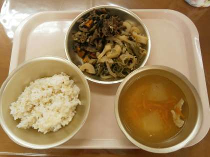 今日はなごみ献立で,玄米ごはん・牛肉とひじきのいため煮・伏見とうがらしとじゃこのたいたん・とうがんのくずひきでした。とうがんのくずひきのとうがんは,とてもやわらかくてとろとろとした口あたりで,しょうがの風味もきいていてとてもおいしかったです。伏見とうがらしとじゃこのたいたんは,甘辛い味でごはんによく合いました。