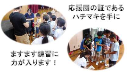 昨日の団結式の後,ペットボトル・うちわ・ポンポンの各応援隊が決定しました。これから道具の制作に入るところです。今日は,「フレーフレーコール」と「いけいけコール」の練習をしました。赤組も白組も合同で,青組として声をはりあげていました。練習の最後に,担当の先生から応援団の証であるハチマキを受け取りました。これからの練習にもさらに気合が入ることでしょう!がんばれ赤組!ファイトだ白組!運動会はもう始まっています。