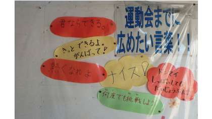 さて,運動会もそうですが,嵯峨小学校では行事を通して,1人1人が力いっぱいがんばることはもちろん,みんなで力を合わせることのすばらしさをも学んでほしいと考えています。その時に,誰かの声援が背中を押し,力がみなぎるということがあります。今月は,「運動会までに広めたい言葉」を掲示板に集めています。この言葉が広まれば,きっともっと素敵な運動会になることでしょう。ご家庭でも「勇気の出る言葉」を集めてみてください。