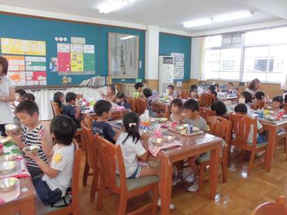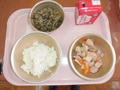 今日の献立は,胚芽米ごはん・牛乳・高野豆腐と野菜のたき合わせ・ほうれん草ともやしのごま煮でした。高野豆腐と野菜のたき合わせの高野豆腐は,最初にけずりぶしのだしと調味料でじっくり煮含めてからたき合わせたので,味がよくしみこんでいてとてもおいしかったです。ほうれん草ともやしのごま煮は,子どもたちは,「ほうれん草大好き。」と言いながらいただきました。だしがよくきいていて,やさしい味でした。