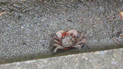 お弁当を食べる「あづまや」へ向かう途中…いました!早速カニを発見!大きい!側溝を優雅に歩いていました。さすがみさきの家ですね。まだまだたくさんの生き物と遭遇することでしょう。